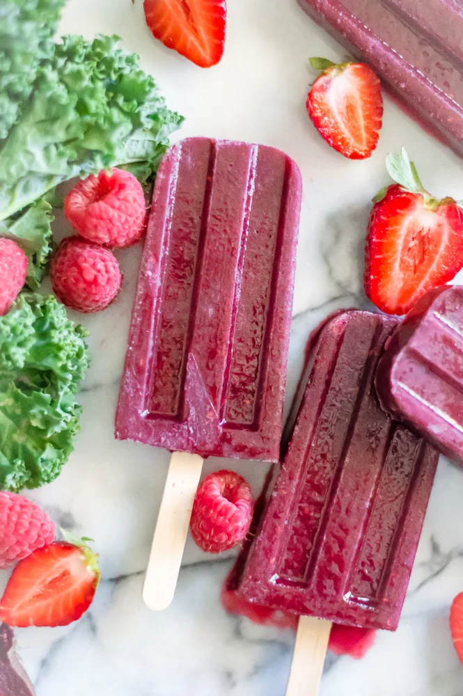 These smoothie pops are loaded with antioxidant-rich red fruits and veggies and with a healthy kick of leafy greens for good measure! So healthy, in fact, that they would make for an awesome addition to the breakfast table. Imagine how jazzed your children would be to find a POPSICLE as part of their breakfast spread!? Seriously. Whether it is 100F degrees outside or -3F, I have never known a red-blooded child to turn up to their nose to trying an ice pop...you just have to be sure to load that ice pop with all kinds of plant goodness!